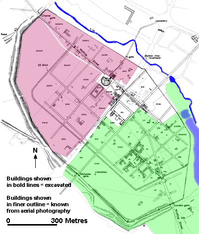 Many archaeologists are becoming increasingly concerned about plough damage to the remains of theRoman City of Verulamiumand are seeking a solution to the problem. This site explains something about Verulamium and its problems.The map below shows that area currently ploughed in red. Public open space is coloured green. |